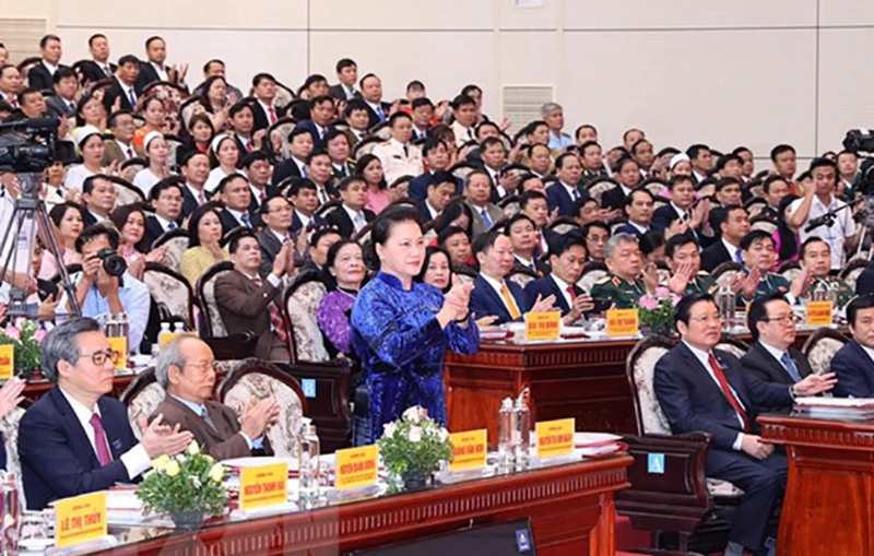 Ủy viên Bộ Chính trị, Chủ tịch Quốc hội Nguyễn Thị Kim Ngân dự khai mạc Đại hội đại biểu Đảng bộ tỉnh Hòa Bình, sáng 2-10. Ảnh: TTXVN