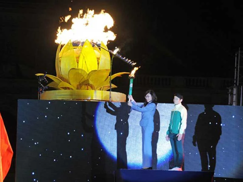 Phó Chủ tịch UBND TP.HCM kiêm Trưởng ban chỉ đạo đại hội Nguyễn Thị Thu đã châm đuốc khai mạc đại hội sau khi nhận đuốc từ VĐV Thạch Kim Tuấn.