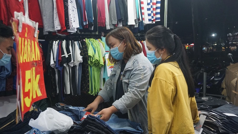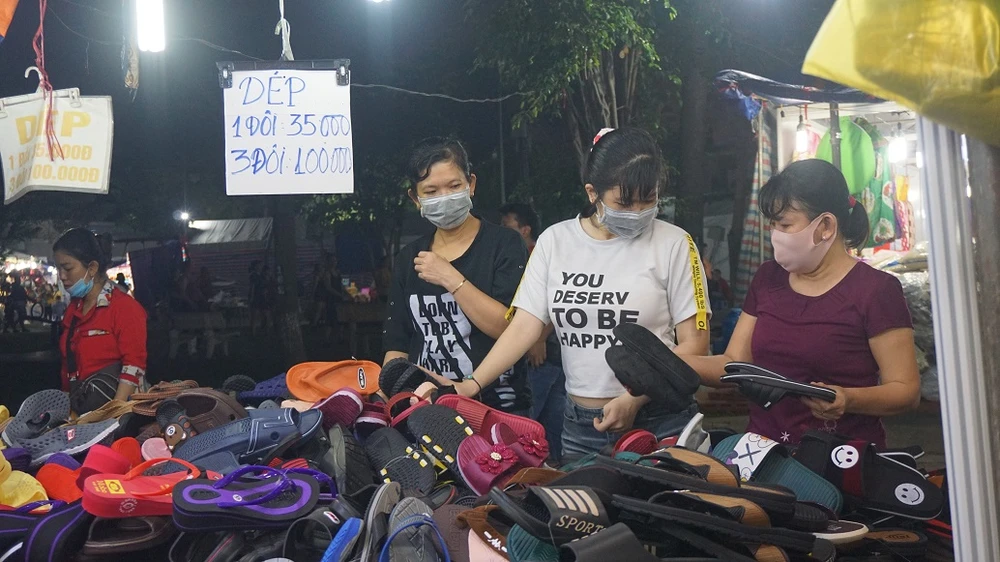 Chị Hiền, quê ở Quảng Ngãi cho biết năm nay dù dịch nhưng chị vẫn cố gắng tiết kiệm để về quê ăn Tết. “Đi ngang đây thấy có phiên chợ nhiều mặt hàng, giá lại hợp lý nên tôi ghé mua về làm quà cho mọi người” - chị Hiền nói và tiếp tục lựa giày dép cho người thân.