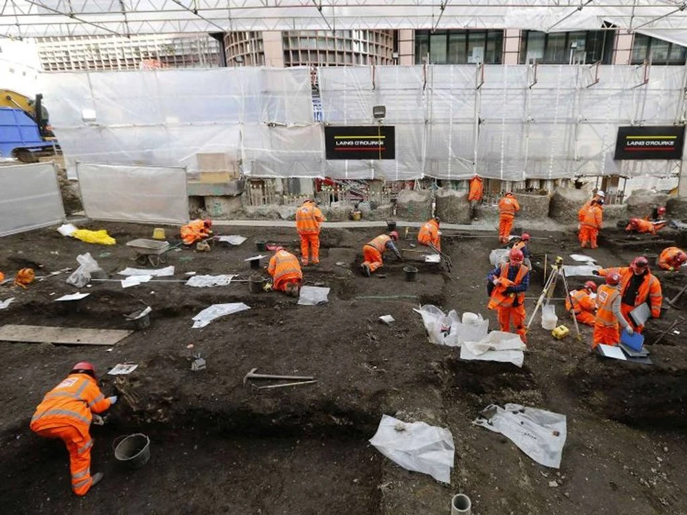 Các nhà khảo cổ đang làm việc trên khu vực dự tính trở thành nơi soát vé cho ga tàu Crossrail (Ảnh chụp từ The Independent)