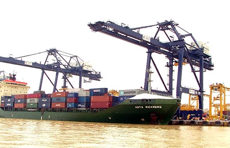 Nhiều doanh nghiệp đang chờ đợi sự kiện “tàu biển mẹ” lần đầu tiên cập cảng TP.HCM. Trong ảnh: Dỡ hàng ở cảng SPCT. Ảnh: MP
