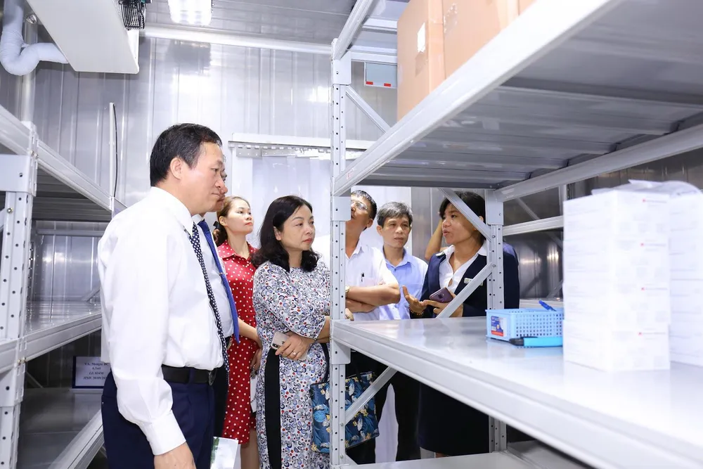 Ông Trịnh Hữu Hùng - Giám đốc Sở Y tế tỉnh Thanh Hóa cùng các khách mời tham quan kho bảo quản vắc xin tại VNVC Thanh Hóa