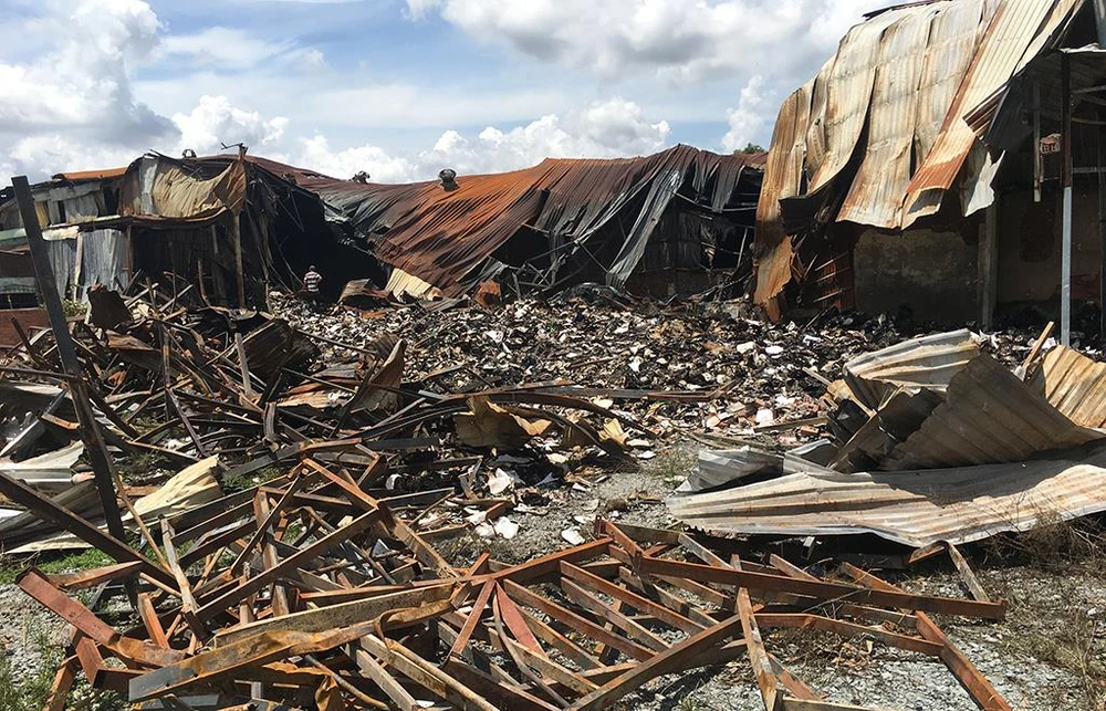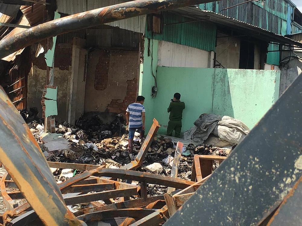 Được biết, khu vực kho nằm ngay mặt tiền đường Mai Bá Hương (xã Lê Minh Xuân, huyện Bình Chánh). Phần kho còn sót lại sau cháy khá tạm bợ.