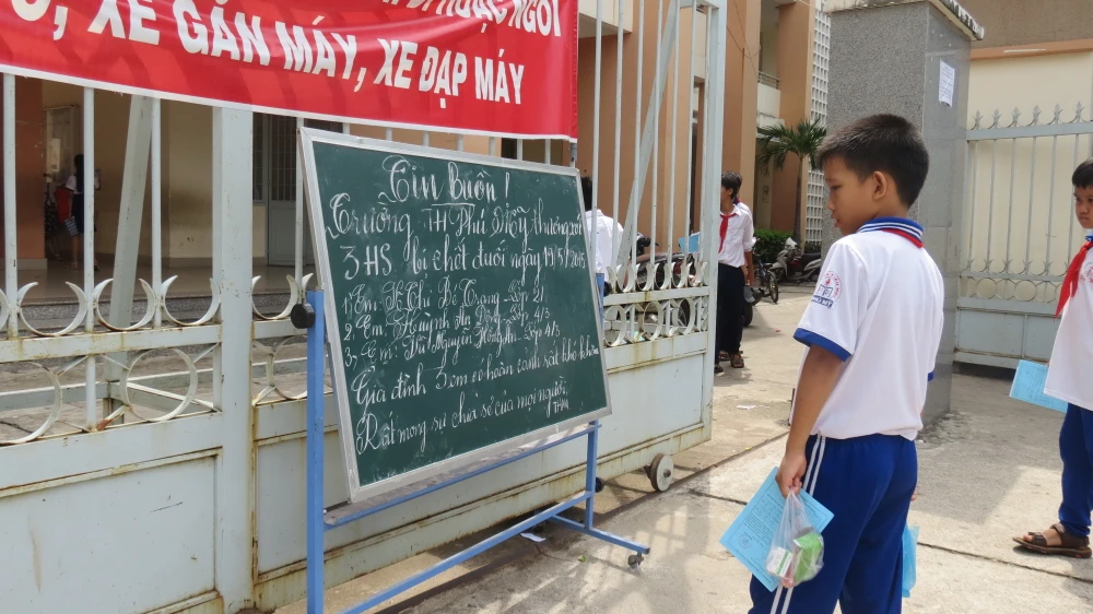 Sáng 20-5, trường tiểu học Phú Mỹ để tấm biển thông tin về ba học sinh của trường gặp nạn để giáo viên, phụ huynh học sinh biết và cùng chia sẻ. Ảnh: TK