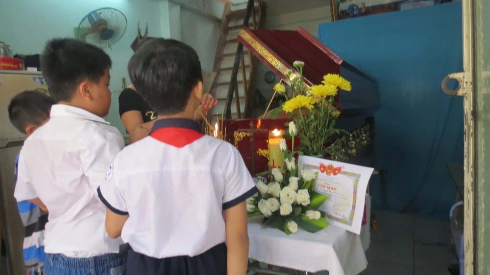 Bạn bè cùng trường tiểu học Phú Mỹ đến viếng bạn Vũ Nguyễn Hồng Ân-lớp trưởng lớp 4/3 trước khi gia đình đưa Ân về quê Đắk Lắk an táng- Ảnh: TK