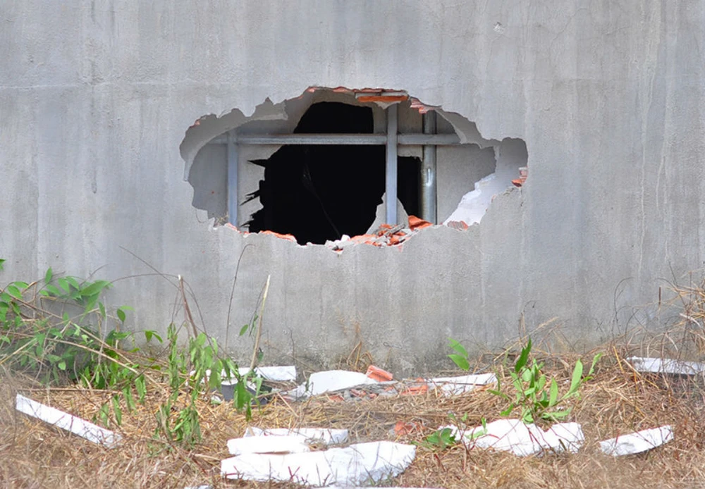 Bức tường đập để giải cứu những người mắc kẹt và bên trong cơ sở đang sửa chữa bị cháy rụi. Ảnh: VH