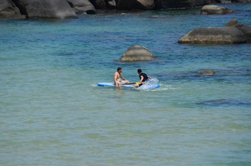 Vì còn hoang sơ nên không gian ở mũi Rồng (thuộc bãi Vũng Bầu) trông rất thanh bình. Đến đây, bạn sẽ được tắm trong làn nước mát lạnh trong veo trông thấy đáy. Ngoài ra, du khách cũng có thể chèo xuồng Kayat quanh các mỏm đá, lặn bắt ốc, bắt cá… rồi nướng cá, uống bia tại chỗ…