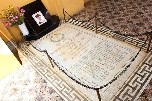 Thi hài cha Tam được chôn ngay cạnh cửa chính nhà thờ. Ảnh: HOÀNG GIANG