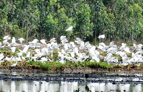Chim, cò bay kín cả một vùng ở Ramsar Láng Sen. Ảnh: HN