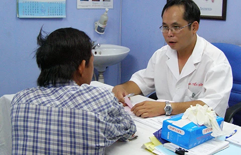 Bác sĩ chuyên ngành nam khoa đang thăm khám sức khỏe cho một thanh niên chuẩn bị kết hôn. Ảnh: TRẦN NGỌC