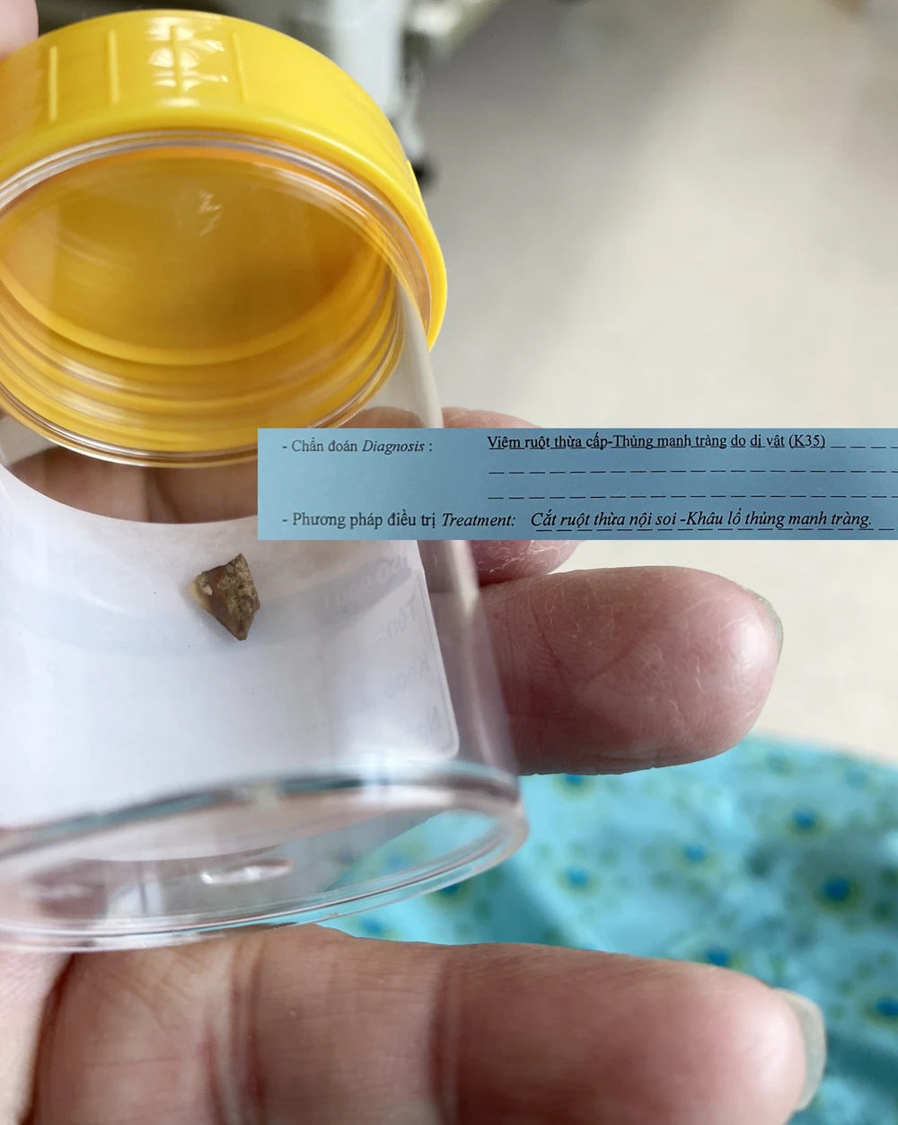 Anh K. chia sẻ rất ngạc nhiên vì cảm thấy hoàn toàn khỏe mạnh, không có dấu hiệu đau bụng và còn chơi thể thao bình thường. Anh đã được phẫu thuật và các bác sĩ phát hiện dị vật là mảnh xương gà, đang gây viêm ruột thừa cấp.