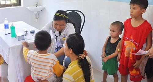 Bác sĩ BV Nhi đồng 2 đang khám bệnh cho trẻ em ở Côn Đảo.