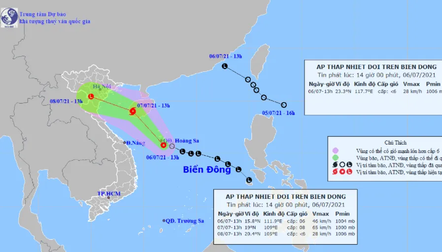 Vào lúc 13 giờ ngày 6-7, vị trí tâm ATNĐ ở vào khoảng 15,8 độ Vĩ Bắc; 111,9 độ Kinh Đông. Sức gió mạnh nhất vùng gần tâm ATNĐ mạnh cấp 6, giật cấp 8. Bán kính gió mạnh cấp 6, giật cấp 8 khoảng 70 km tính từ tâm ATNĐ.