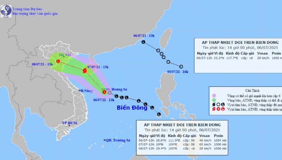 Đối với vùng áp thấp ở vùng biển phía đông nam quần đảo Hoàng Sa, Trung tâm KTTVQG cũng cho biết vào đêm 5-7, vùng áp thấp này đã mạnh lên thành ATNĐ.