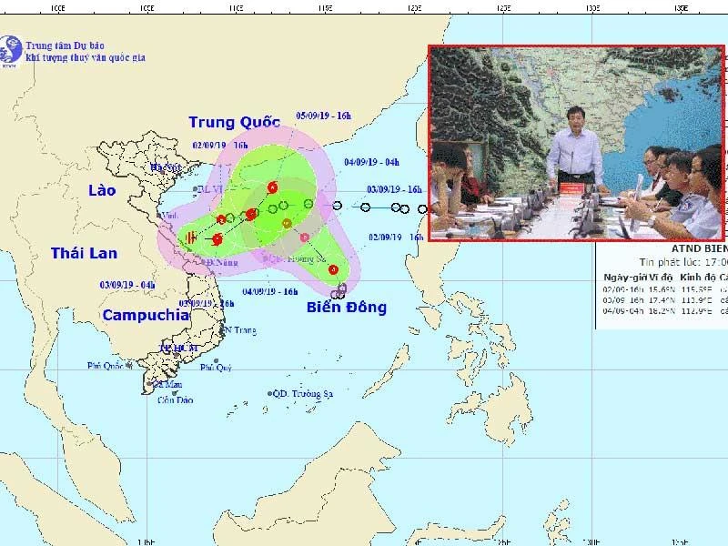 Ông Trần Quang Hoài, Phó Trưởng Ban chỉ đạo trung ương về phòng, chống thiên tai, chủ trì cuộc họp triển khai ứng phó với áp thấp nhiệt đới phức tạp vào sáng 2-9. Ảnh: A.HIỀN. Hình ảnh về vị trí và đường đi của áp thấp nhiệt đới “kép” trên biển Đông. Ảnh: NCHMF