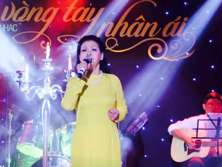 Ca sĩ Khánh Ly trong áo dài lụa vàng cho những bản nhạc mở màn.