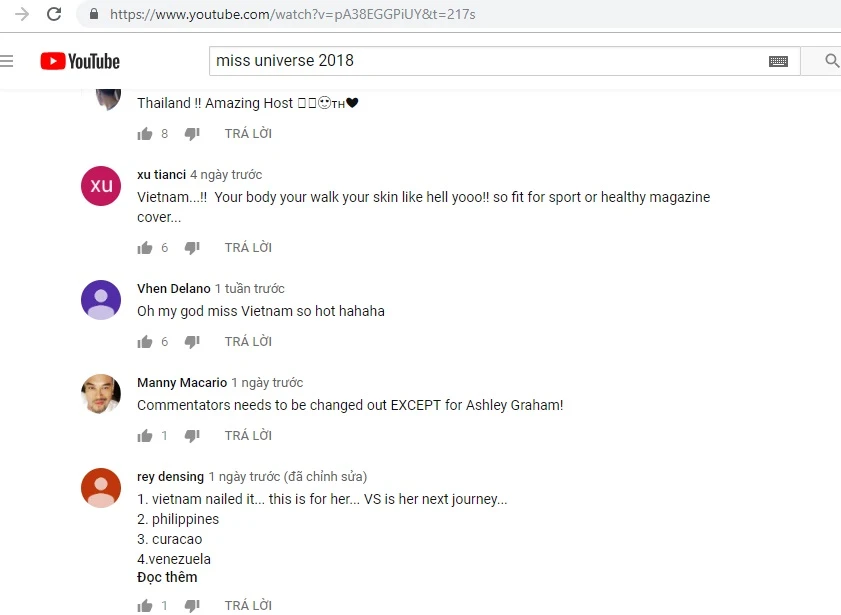 Khán giả trên kênh YouTube vẫn tiếp tục bình luận về các hoa hậu của Miss Universe 2018 đã kết thúc từ 17-12 năm ngoái. Điều đó cho thấy sức hút của cuộc thi sắc đẹp này thật bền bỉ.