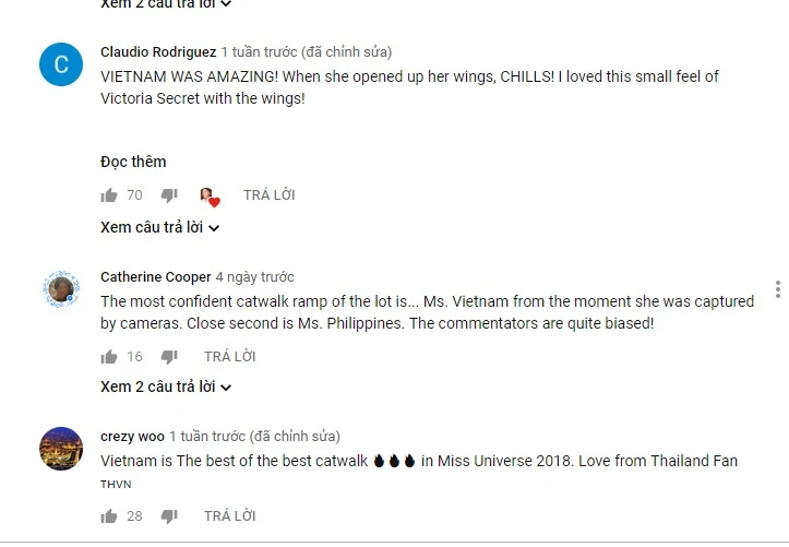 Điều đáng nói là trong các bình luận thì H'Hen Niê "chiếm sóng" đáng kể, cô được nhắc đến nhiều hơn bất cứ một hoa hậu nào. Hôm nay, khán giả Kent A viết: "Tôi xem lại nhiều lần Miss Vietnam bước đi trong bản nhạc. Tôi cảm thấy như đang xem Victoria's secret show". Nhiều bình luận có nội dung tương tự đã "rải đều" vài ngày trước, một tuần trước...