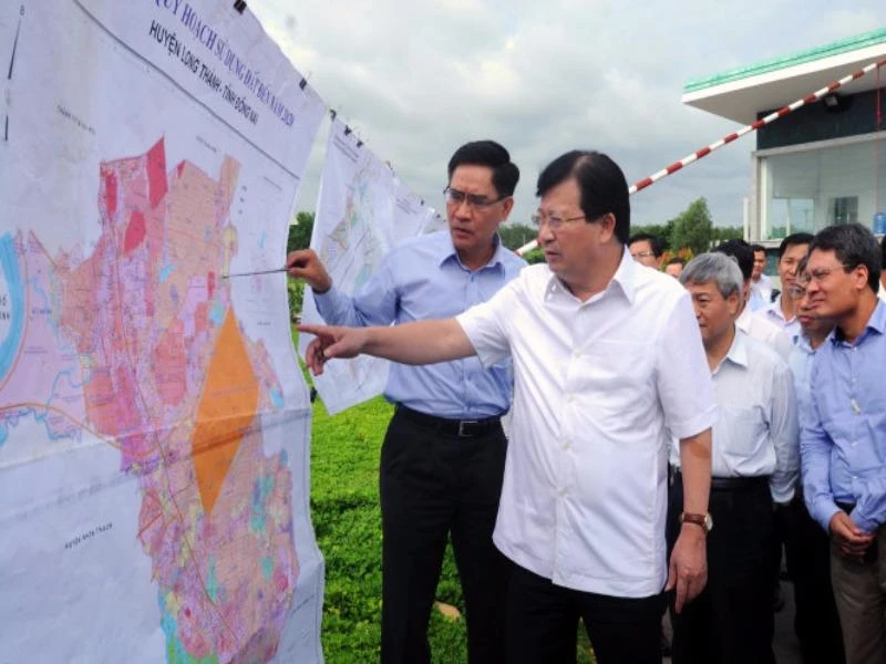 Phó thủ tướng Trịnh Đình Dũng xem bản đồ quy hoạch sử dụng đất tại vùng quy hoạch sân bay quốc tế Long Thành (ảnh chụp sáng 9-7-2016). Ảnh: TTO