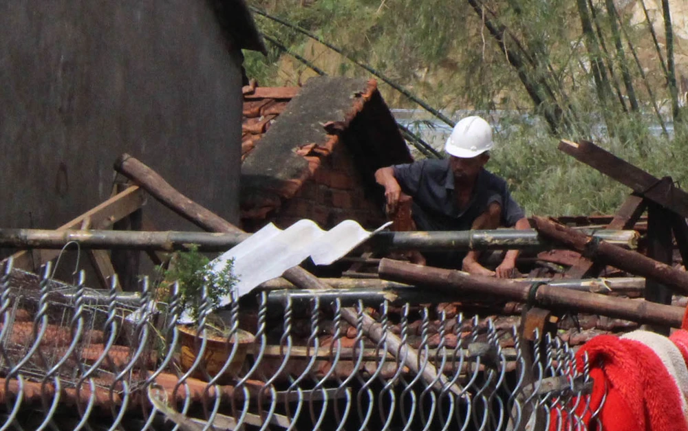 Người dân xã Đại Lãnh, huyện Vạn Ninh (Khánh Hòa) sửa lại nhà bị hư hỏng do bão số 12 để ứng phó bão số 14. Ảnh: TẤN LỘC