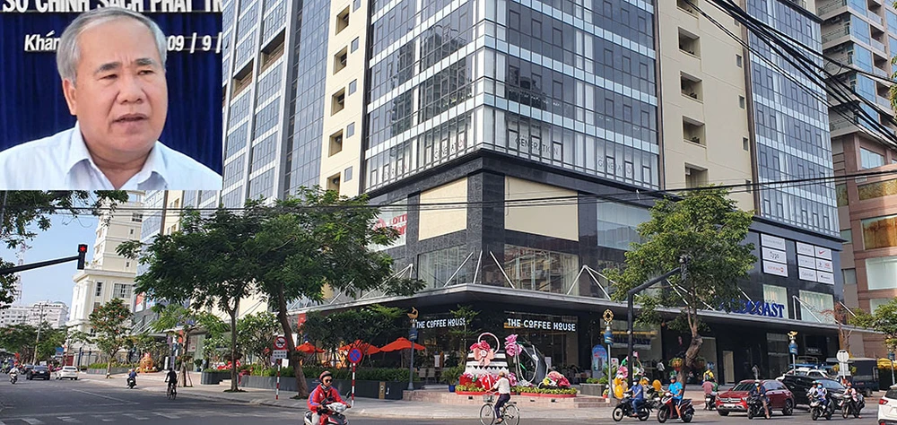 Ông Đào Công Thiên (ảnh nhỏ) và khu đất trụ sở cũ Trường Chính trị tỉnh Khánh Hòa, hiện là tòa nhà dự án Nha Trang Center 2. Ảnh: TẤN LỘC