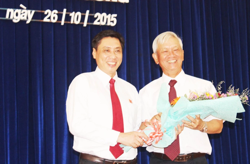 Tân Chủ tịch UBND tỉnh Khánh Hòa Lê Đức Vinh (bên trái) tặng hoa nguyên Chủ tịch UBND tỉnh Nguyễn Chiến Thắng.