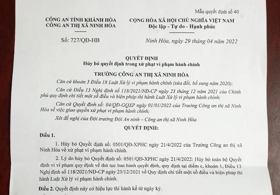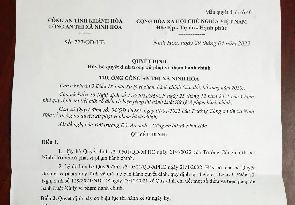 Công an thị xã Ninh Hòa hủy bỏ quyết định xử phạt trên do vi phạm quy định về thủ tục ban hành quyết định, quy định tại điểm c, khoản 1, Điều 13 Nghị định 118/2021 của Chính Phủ.