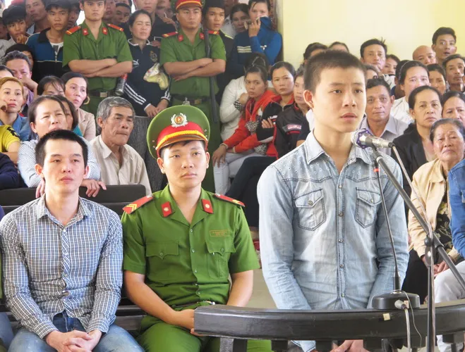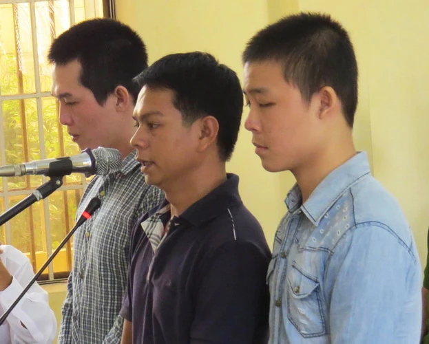 Hai cựu công an xã cùng bị cáo học sinh tại phiên tòa sáng nay. Ảnh: TẤN LỘC