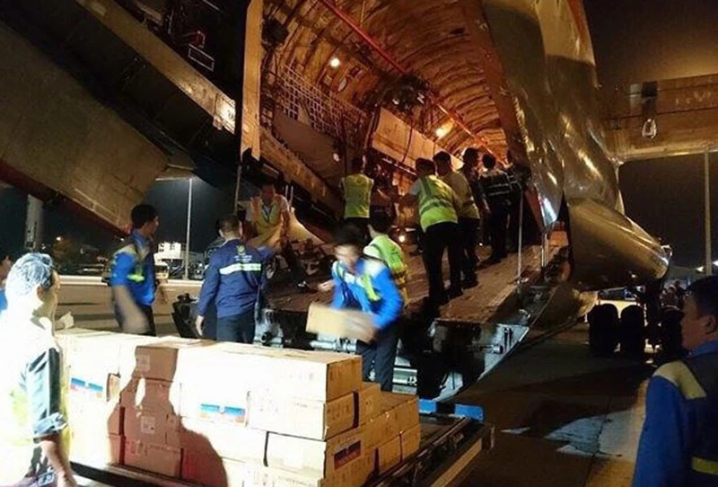 Tiếp nhận 40 tấn hàng viện trợ của Nga tại sân bay Cam Ranh. Ảnh: TPO