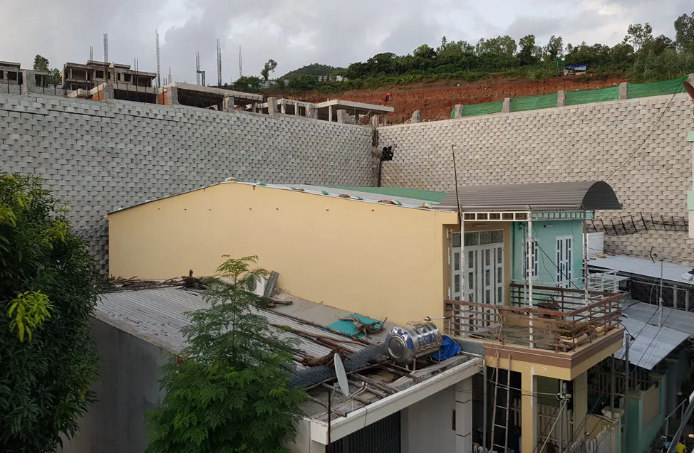 Bức tường thành trên sườn núi xây dựng không phép nằm ngay sát nhà dân. Ảnh: VH