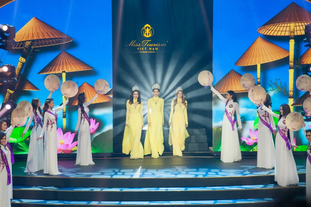 Ba hoa hậu quốc tế diện áo dài Việt xuất hiện ấn tượng trên sân khấu.