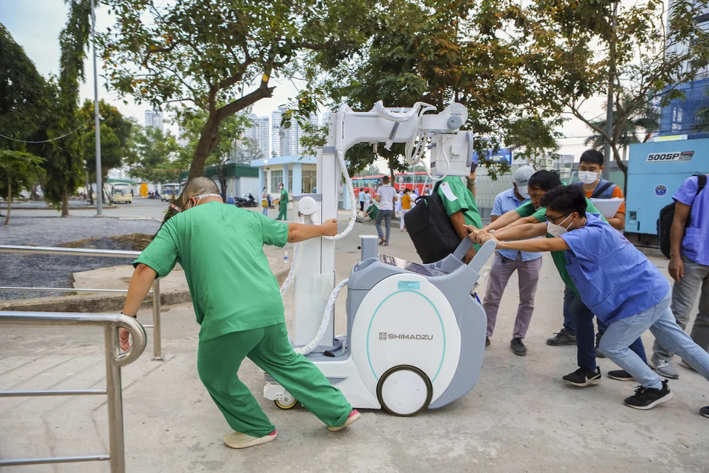 Nhân viên bệnh viện vận chuyển máy chụp XQ di động.