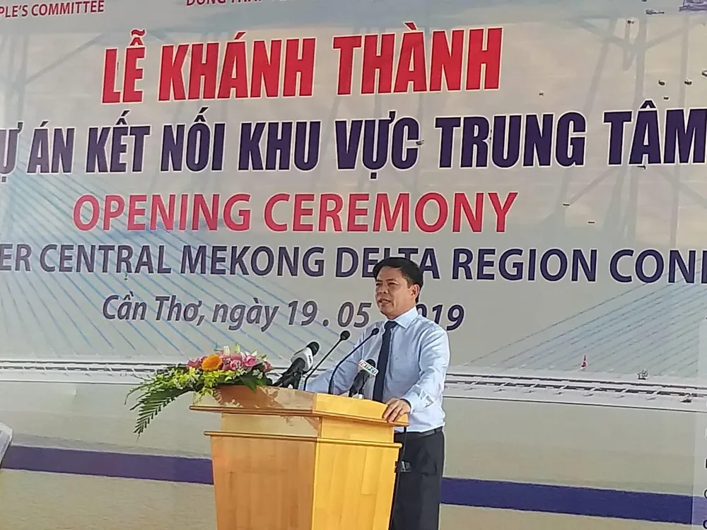 Việc hoàn thành để đưa công trình cầu Vàm Cống góp phần hoàn thiện mạng lưới giao thông khu vực ĐBSCL, tạo động lực phát triển KT-XH (Ảnh: Bộ trưởng Bộ GTVT Nguyễn Văn Thể phát biểu tại lễ khánh thành).