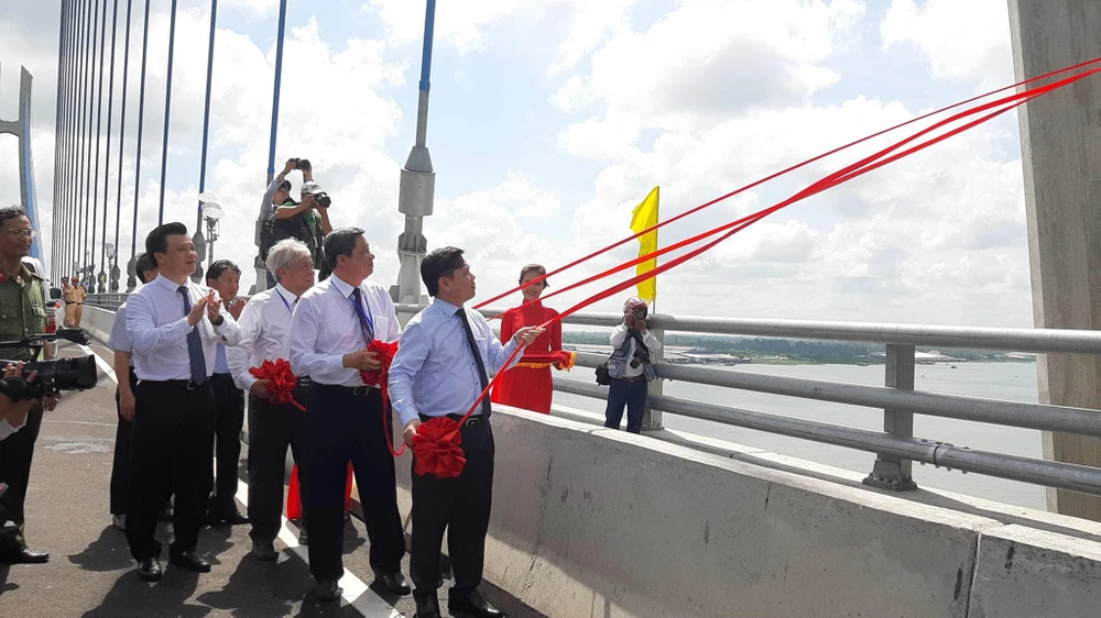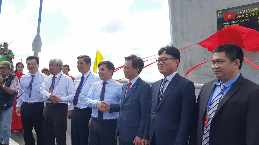 Bộ trưởng Bộ GTVT Nguyễn Văn Thể cùng lãnh đạo các địa phương, nhà tài trợ và nhà thầu... chia sẻ niềm vui ngay trên cầu Vàm Cống.