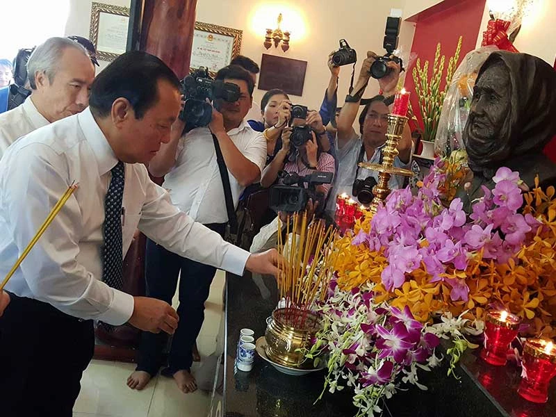 Các đại biểu dâng hương tại nhà tưởng niệm Bà mẹ Việt Nam anh hùng - Anh hùng lực lượng vũ trang Nguyễn Thị Rành. Ảnh: H.MINH