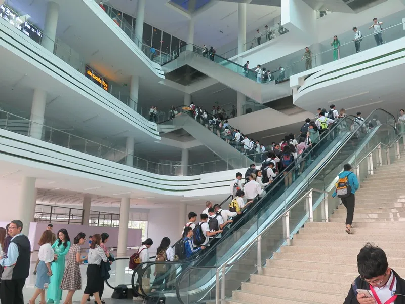 Mỗi tầng của nhà văn hóa đều có hệ thống thang cuốn, thang bộ và thang máy.