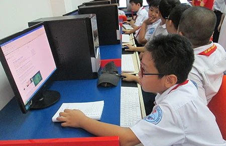 Học sinh đang tìm tài liệu trên máy vi tính tại thư viện. Ảnh: PHẠM ANH