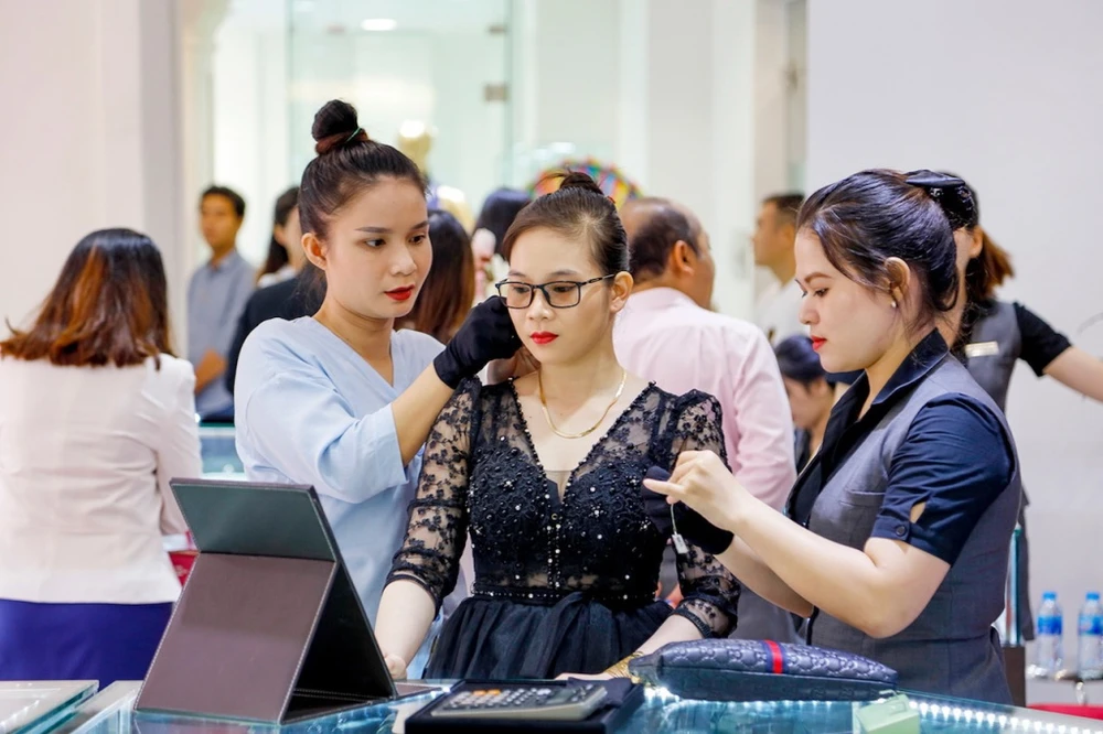 Đông đảo khách hàng tham quan và lựa chọn nữ trang tại siêu thị trang sức cao cấp Lộc Phúc Fine Jewelry.