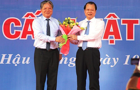 Bộ trưởng Hà Hùng Cường tặng hoa cho Phó Thủ tướng Vũ Văn Ninh. Ảnh: G.TUỆ