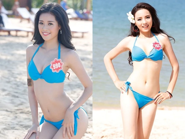 Năm 20 tuổi Khánh Vân (ngoài cùng bên phải) tiếp tục thi Hoa hậu Hoàn vũ Việt Nam. Phạm Hương (ngoài cùng bên trái) cũng tham gia