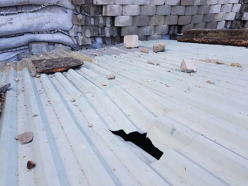 Đá từ bức tường chắn rơi xuống làm lủng mái tôn nhà dân. Ảnh: TL