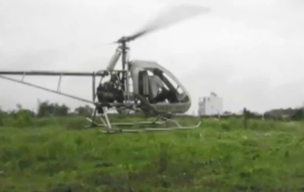 Ông Hiển đang tập bay thử nghiệm với chiếc trực thăng tự chế.