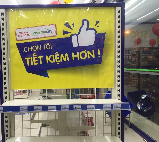 Kệ khẩu trang của cửa hàng Pharmacity quận Gò Vấp trống trơn.