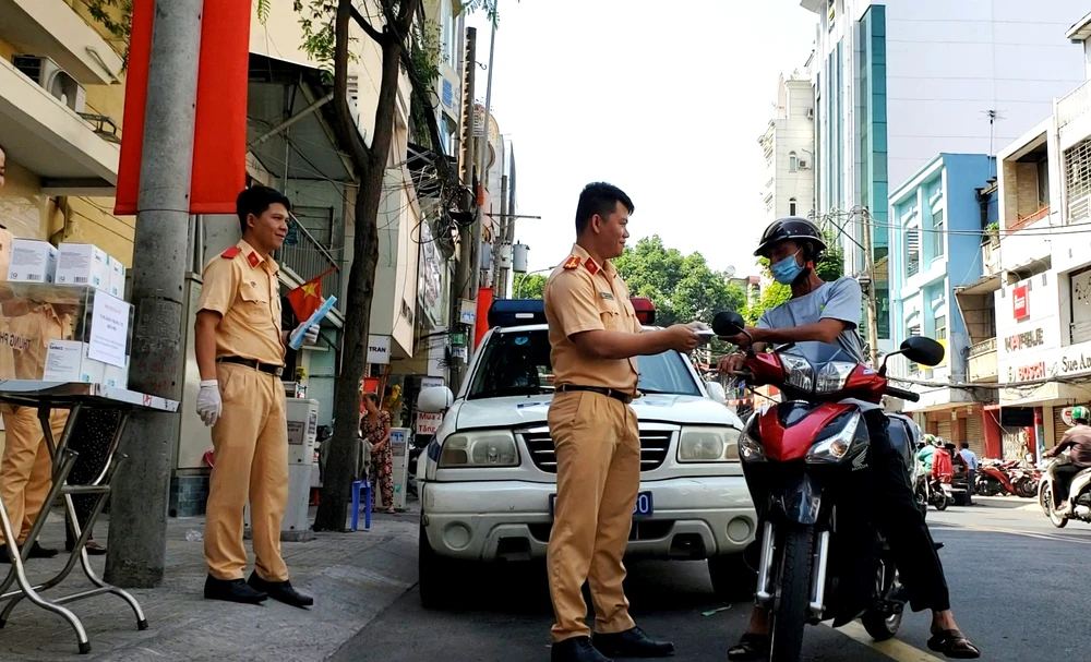 Các chiến sĩ CSGT Công an TP.HCM đang phát khẩu trang miễn phí cho người dân tại đường Võ Văn Tần, quận 3 vào ngày 3-2. Ảnh: TỰ SANG