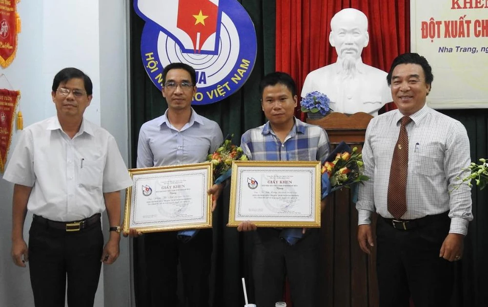 Ông Nguyễn Tấn Tuân, Phó Bí thư Thường trực Tỉnh ủy Khánh Hòa (bìa trái) và nhà báo Đoàn Minh Long, Chủ tịch Hội Nhà báo tỉnh Khánh Hòa (bìa phải), khen thưởng hai PV. Ảnh: ĐỆ NHẤT