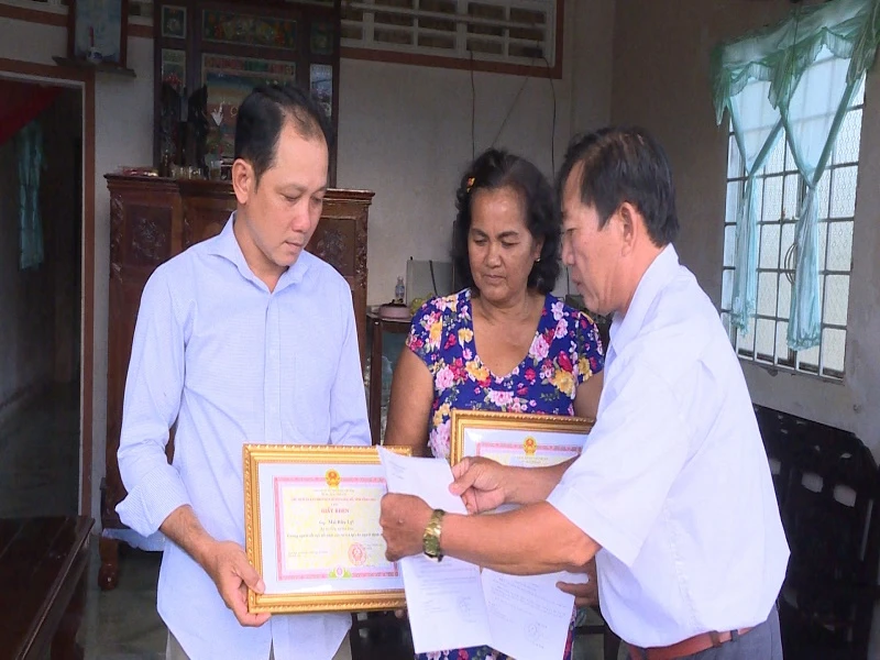 Ông Lợi, bà Thắng nhận bằng khen và tiền thưởng của Chủ tịch UBND huyện Long Hồ. Ảnh: HẢI DƯƠNG.
