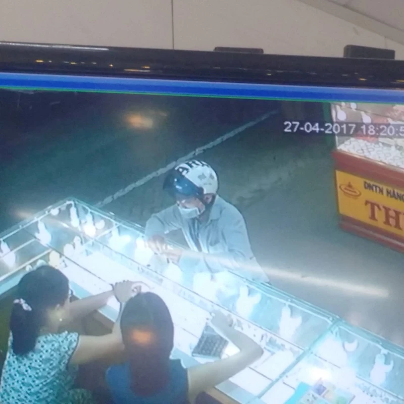Nghi phạm đang thực hiện hành vi cướp tài sản tại tiệm vàng ở thị xã Hương Thủy được camera an ninh ghi lại.