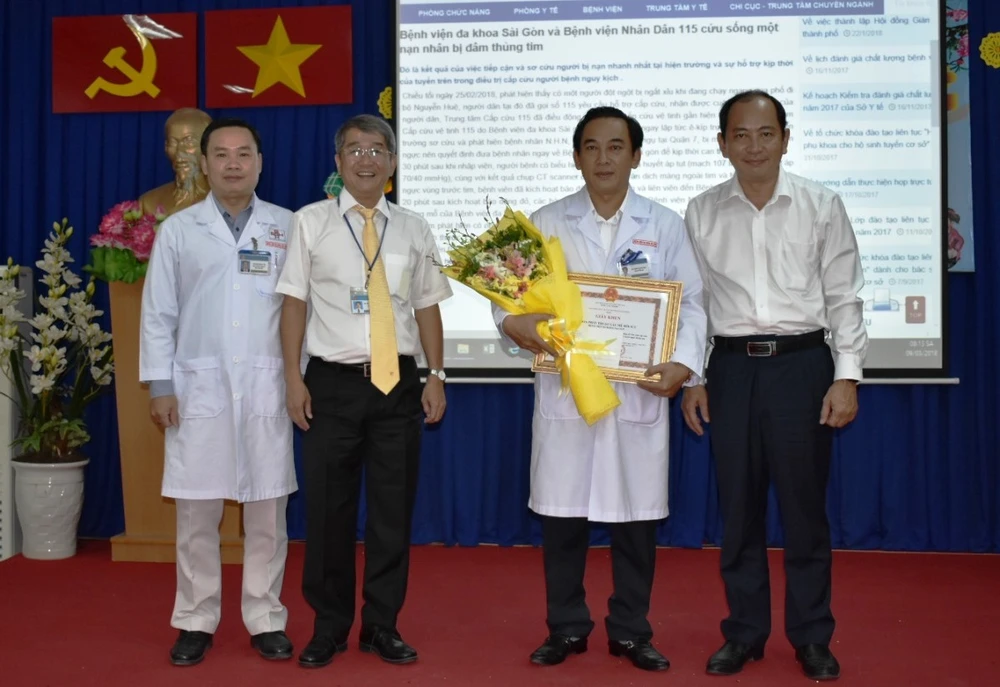 Ngày 9-3, PGS-TS-BS Tăng Chí Thượng, Phó Giám đốc Sở Y tế TP.HCM, đã trao tặng bằng khen cho tập thể khoa Phẫu thuật gây mê hồi sức, BV Đa khoa Sài Gòn và 12 cá nhân (10 BS, điều dưỡng của BV và 2 BS, điều dưỡng của BV Nhân dân 115) do đã có thành tích xuất sắc trong việc triển khai báo động đỏ liên viện cứu sống người bệnh bị đâm thủng tim tại phố đi bộ Nguyễn Huệ (quận 1, TP.HCM).