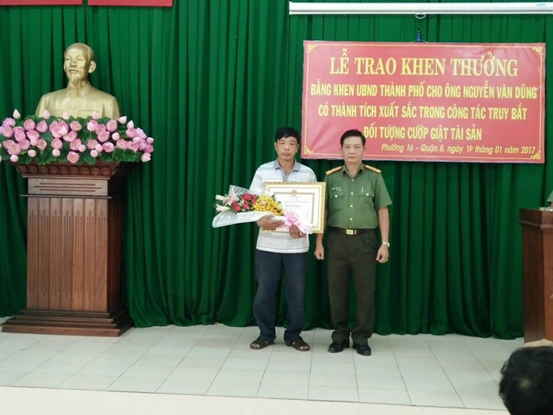 Ngày 19-1, Công an TP.HCM phối hợp với các đơn vị liên quan tổ chức lễ trao bằng khen cho ông Nguyễn Văn Dũng (55 tuổi, quê Rạch Giá, Kiên Giang, buôn bán ở Chợ Phú Định, phường 16, quận 8) vì có thành tích xuất sắc trong công tác truy bắt đối tượng cướp giật tài sản.