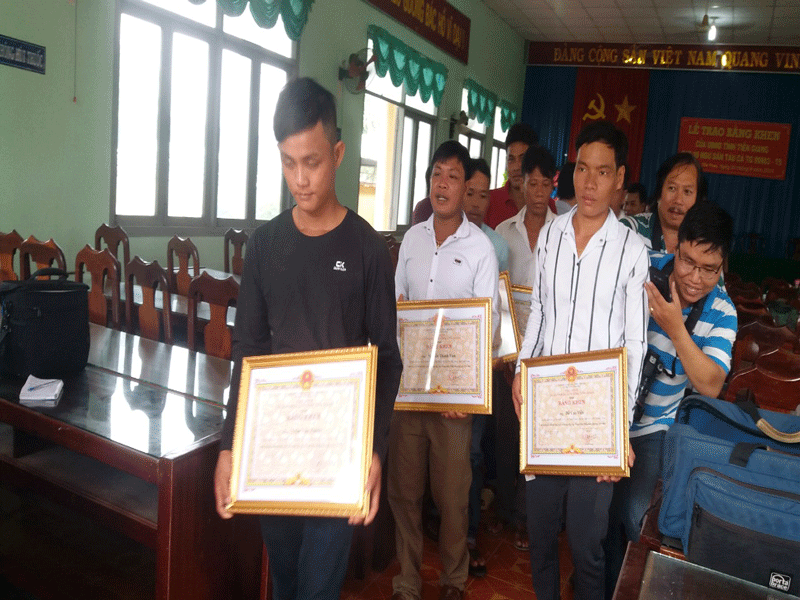Tại buổi lễ, chín ngư dân được UBND tỉnh tặng bằng khen cùng với số tiền thưởng gần 1,5 triệu đồng/người, gồm thuyền trưởng Nguyễn Thanh Tâm và các thuyền viên: Lê Văn Hoàng, Nguyễn Thành Tâm, Đinh Văn Trưng, Đỗ Thanh Hải, Phạm Thanh Tuấn (cùng ngụ xã Tân Phước, huyện Gò Công Đông), Trần Văn Thinh, Trần Duy Trường (cùng ngụ xã Tân Tây, huyện Gò Công Đông) và Đỗ Cao Viễn, ngụ xã Tam Thanh, huyện Tam Kỳ, tỉnh Quảng Nam.